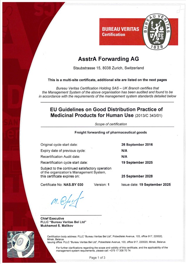 A tanúsítvány igazolja a helyes elosztási gyakorlatra (GDP) vonatkozó EU iránymutatások betartását. A tanúsítást a Bureau Veritas, a tesztelés, az ellenőrzés és a tanúsítás globális vezetője végezte. Bizonyítványunk még egy okot kínál arra, hogy ügyfeleink megbízhassanak bennünk gyógyszerek megbízható szállításakor. Tanúsítványunk bizonyítja elkötelezettségünket a legfrissebb ellenőrzési technológiák használata mellett, valamint a szállítmányokkal kapcsolatos információk ügyfelekkel történő megosztása mellett a rakományszállítás minden szakaszában.